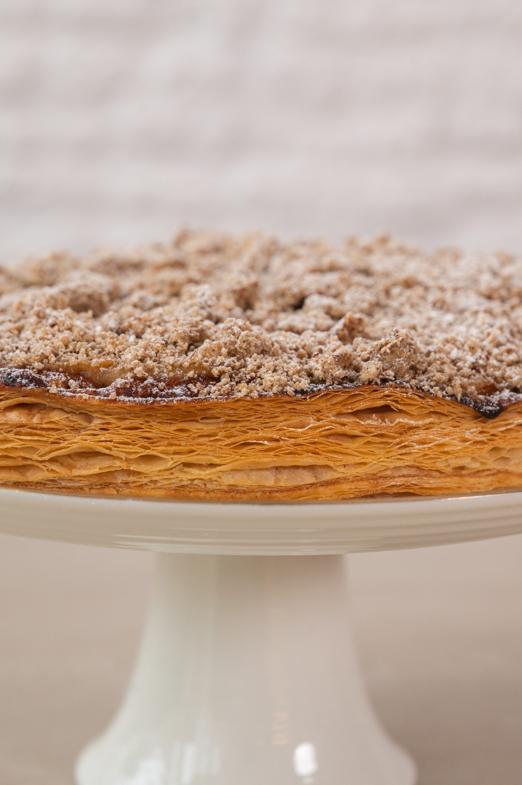 Une pâte feuilletée croustillante au beurre AOP Charentes-Poitou, garnie d’une compote de pommes lentement caramélisées et d’un streusel sarrasin qui apporte une touche gourmande.